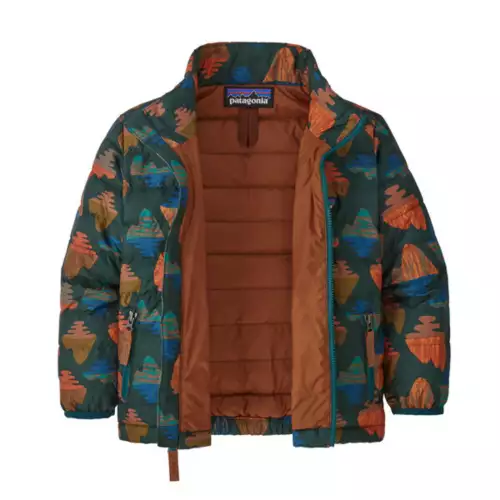 Solid shell is made of 100% recycled polyester with a DWR (durable water repellent) finish; print shell and lining are recycled polyester with a PFC-free DWR finish (durable water repellent coating that does not contain perfluorinated chemicals) 700-fill-power 100% Recycled Down (duck and goose down reclaimed from down products) is compressible and warm; quilt-through construction keeps down in place Full-length zipper with wind flap and reflective webbing pull; zipper garage protects chin Two zippered handwarmer pockets with reflective webbing pulls Spandex binding around cuffs and elasticized back hem keep cold out Hand-me-down ID label Regular fit