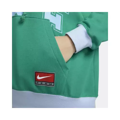 The Women’s Nike Sportswear Team Fleece Hoodie is inspired by the lettering used on letterman jackets and hoodies in high school for a throwback, athletic vibe. Made from a blend of cotton and polyester, the Nike Sportswear Team Fleece Hoodie is super soft and durable, while the brushed interior helps provide added warmth and a cozy feel. With the dropped shoulders and roomy sleeves, you’ll enjoy an oversized, relaxed feel for those cozy days and easier layering. Additional features include a hood with drawcord, front kangaroo pocket, and ribbed hem and wrist cuffs.