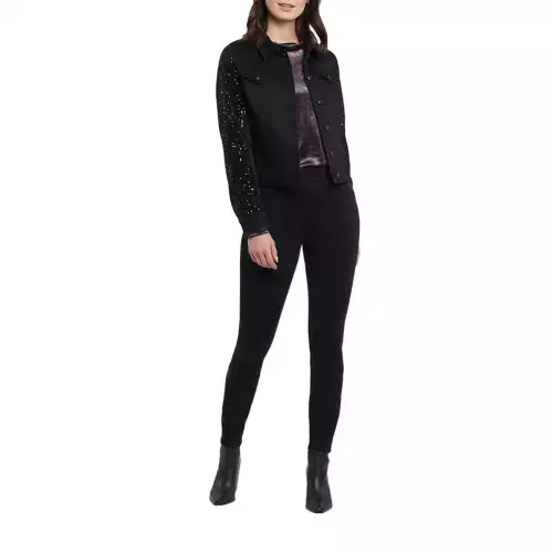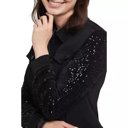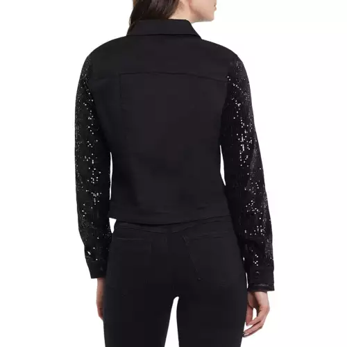 We love dressing our favourite basics up, and this chic jacket makes the job easy! We’re crushing hard on this denim jacket that checks all the classic boxes with its button front, shirt collar, decorative chest pockets, functional side pockets, 22″ length, and soft stretch denim construction. To top it all off, we added sequin sleeves with elastic cuffs to complete the look, guaranteeing that you’ll make a style statement every time you slip it on.